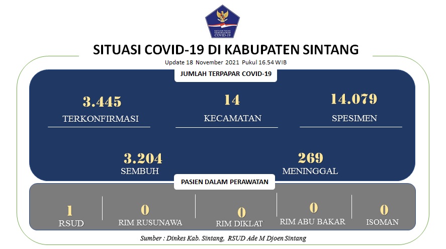 Berikut kami sampaikan update terkini situasi perkembangan Covid-19 per 18 November 2021 di Kabupaten Sintang.