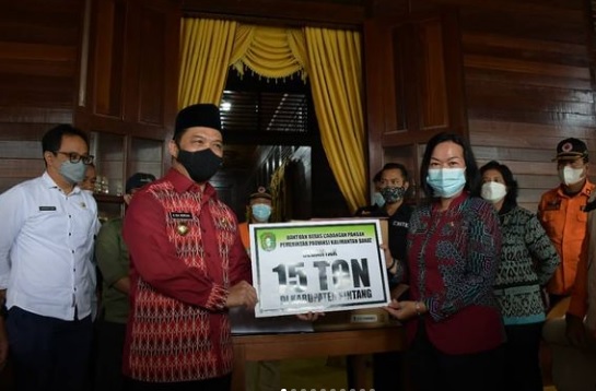 Wakil Gubernur Kalimantan Barat Drs. H. Ria Norsan, MM.MH, memberikan langsung bantuan sosial berupa sembako kepada Plh. Bupati Sintang Dra. Yosepha Hasnah, M.Si, untuk selanjutnya disalurkan kepada korban terdampak bencana banjir di Kabupaten Sintang bertempat di Pendopo Bupati Sintang pada 28/10/21.