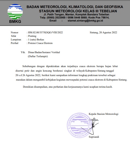 Sehubungan dengan prakirakan akan terjadinya cuaca ekstrem berupa hujan lebat disertai petir dan angin kencang berdurasi singkat diwilayah Kabupaten Sintang tanggal 20 s.d 26 Agustus 2022,