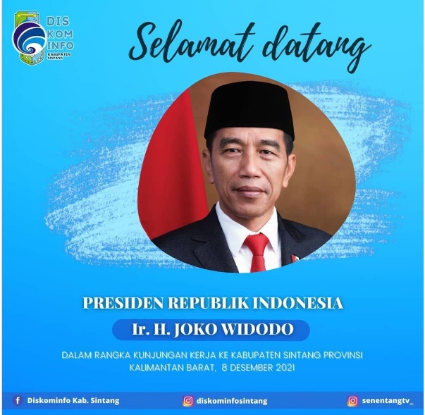 Dinas Komunikasi dan Informatika Kabupaten Sintang mengucapkan Selamat Datang di Kabupaten Sintang Bapak Presiden Republik Indonesia Ir. H. Joko Widodo yang akan melakukan kunjungan kerja ke Kabupaten Sintang Provinsi Kalimantan Barat pada Rabu, 8 Desember 2021.