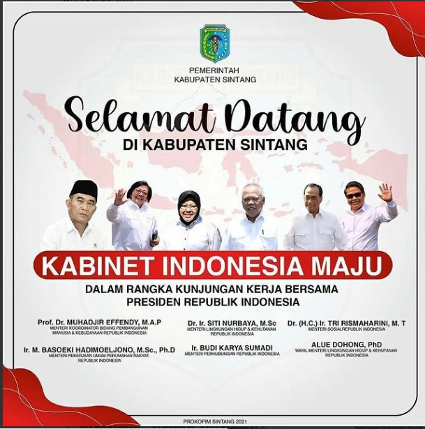 Pemerintah dan Masyarakat Kabupaten Sintang mengucapkan Selamat Datang di Kabupaten Sintang untuk Anggota Kabinet Indonesia Maju Republik Indonesia dalam rangka kunjungan kerja ke Kabupaten Sintang pada 6, 7 dan 8 Desember 2021.