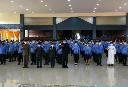 Bupati Sintang, dr. H. Jarot Winarno, M. Med., PH di dampingi Sekretaris Daerah Kabupaten Sintang Dra. Yosepha Hasnah, M. Si, Memimpin Upacara Pelantikan dan Pengambilan Sumpah/Janji penyetaraan jabatan administrasi ke dalam jabatan fungsional di Lingkungan Pemerintah Kabupaten Sintang, Bertempat di Pendopo Bupati Sintang, 30/12/21 Pada Kamis Pagi.