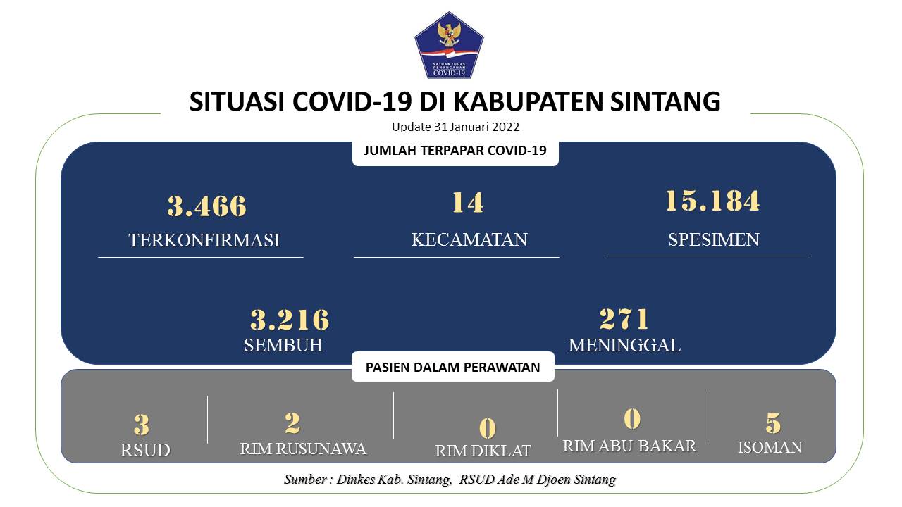 Berikut kami sampaikan update terkini situasi perkembangan Covid-19 per 31 Januari 2022 di Kabupaten Sintang.