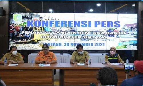 Kepala Dinas Komunikasi dan Informatika Kabupaten Sintang Kurniawan, S.Sos, M.Si, memimpin langsung jalannya Konferensi Pers Terkait berakhirnya masa tanggap darurat bencana banjir di Kabupaten Sintang sesuai dengan Surat Keputusan Bupati Sintang Nomor 360/1217/KEP-BPBD/2021 Tentang Penetapan Perpanjangan Ke dua Kasus Bencana Banjir, Angin Puting Beliung, dan Tanah Longsor Kabupaten Sintang Tahun 2021 bertempat di ruang Command Center Setda Sintang Pada Selasa Sore 30/11/21.