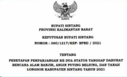 Bupati Sintang dr. H. Jarot Winarno, M. Med. PH memperpanjang Status Tanggap Darurat Bencana Alam Banjir, Angin Puting Beliung, Dan Tanah Longsor Kabupaten Sintang Tahun 2021 sampai 30 November 2021 mendatang. Keputusan tersebut tertuang dalam Keputusan Bupati Sintang Nomor : 360/1217/KEPBPBD/2021 tangal 17 November 2021 Tentang Penetapan Perpanjangan Ke Dua Status Tanggap Darurat Bencana Alam Banjir, Angin Puting Beliung, Dan Tanah Longsor Kabupaten Sintang Tahun 2021.